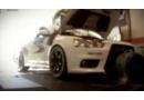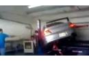 一辆三菱LANCEREVO在马力机上准备进行功率测试,可以看到尾部两根红绳已将车稳稳地固定住了。但是在它刚开始接受测试时,车头跑偏,一歪身就从马力机上掉落下来,真是百密一疏,忘记了将前轮固...