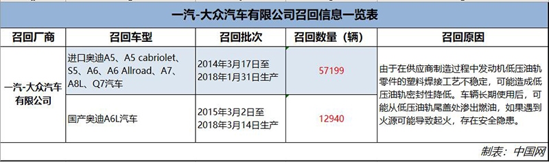 2月28日,国家市场监督管理总局公告,一汽-大众汽车有限公司将自2019年4月4日起,召回部分装备V6 TFSI发动机的进口和国产奥迪汽车,共计70139辆。具体如下: