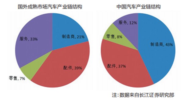 有数据显示,欧美等发达国家及地区汽车后市场利润贡献占比达到57%,是产业链中最稳定的利润来源,整车和零部件制造合计利润仅为38%。相比之下,我国汽车产业链中,后市场利润贡献只有28%,整车制造利润近70%,差距非常大。从公开数据对比来看,与欧美市场汽车产业链结构相比,我国在制造商和服务这两方面差别最大,目前我国汽车产业链仍由制造商占主导(43%),售后服务占比较小(12%)。