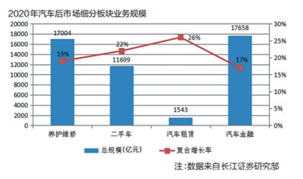 根据长江证券研究部的预测,到 2020年,养护维修、二手车和汽车金融、汽车保险均是万亿规模的市场,汽车租赁相对规模小些。从复合增长率看,养护维修、二手车、汽车金融和汽车租赁均在17%以上,处于快速发展时期。