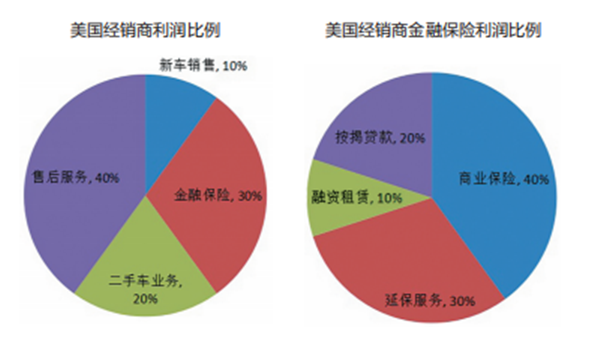 从国外经销商的利润组成来看,新车销售利润仅占小部分,其他均来自于售后服务、金融保险、二手车业务等方面。以美国经销商利润为例,金融保险占其利润来源的30%。在金融保险利润中,商业保险占40%,延保服务占30%。