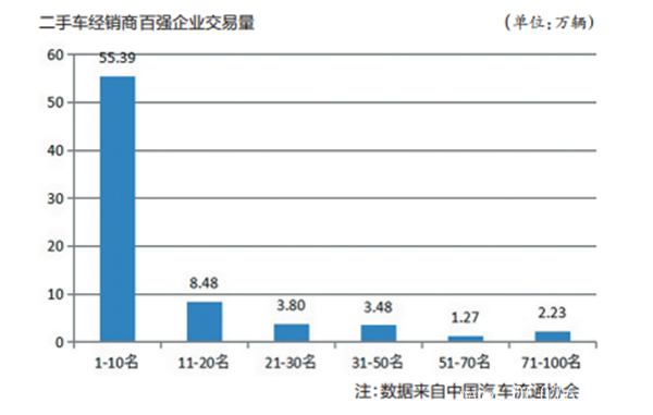 中国汽车流通协会数据显示,2018年二手车经销商百强企业交易量为74.66万辆,同比增长14.61%;交易额815.69亿元,同比增长8.29%。其中,前20名企业交易量占百强企业总交易量的85.6%。排名前10的企业交易55.39万辆,同比增长53.36%,占百强企业的74.19%;交易额为542.23亿元,同比增长38.98%,占百强企业的66.48%。