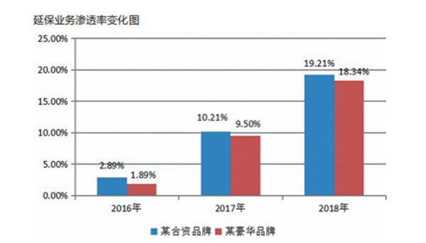 相比之下,汽车延保业务2008年左右就已进入中国市场,但在2015年以前,基本上处于无人问津阶段。近年来,该业务受到越来越多消费者的重视,各大相关企业纷纷推出定制化的汽车延保产品,其中包括部分前瞻性强的整车厂、经销商集团和4S店,再加上传统保险公司的进入,以及第三方独立延保机构的出现,使得汽车延保市场连续3年渗透率呈翻番式增长(如下图所示),未来还有较大的提升空间和潜力。