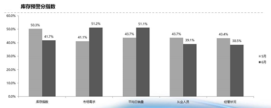 6月,汽车经销商库存预警指数为50.4%,接近荣枯线的临界值。流通协会方面表示,6月部分地区国五车型加大促销,消费者趁机购车,使得销量得到回升。此外,不提前实施国六地区的经销商为完成半年度考核冲量促销,库存压力明显减轻。