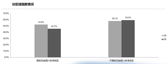 此外,流通协会还单独列出实施和未实施国六省份的库存指数。其中,提前实施国六的区域预警指数为45.7%,位于警戒线之下,相比5月大幅下降;未提前实施区域预警指数为59.5%,远高于荣枯线。郎学红表示,国五、国六切换对于市场的影响很大,提前实施国六的区域通过“以价换量”拉动消费需求,但是经销商付出了惨痛代价。