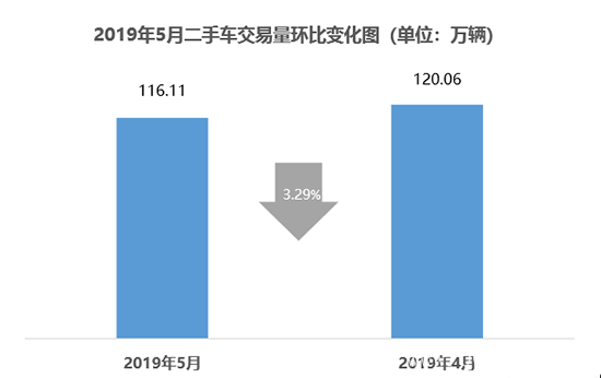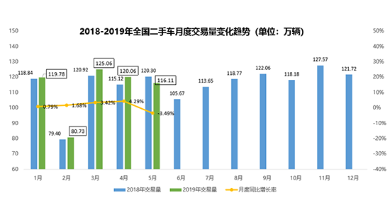 新车市场的萎靡不振,同样传导至二手车市场。5月,全国二手车市场交易量为116.11万辆,同比下降3.49%,环比下降3.29%,这也是年内首次出现同环比双降;1-5月,二手车累计交易量为561.7万辆,同比增长1.29%。