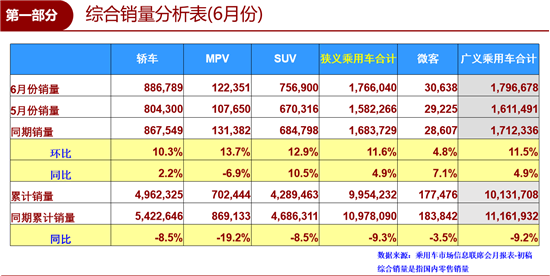 6月,我国狭义乘用车销量达到1766040辆,环比上升11.6%,同比上涨4.9%,车市时隔12个月后再迎正增长。综合1-6月,我国狭义乘用车累计销量为9954232辆,下滑幅度达9.3%,而这已是建立在5月、6月“国五清库存”带来销量大幅提升之上的成绩,因此综合来看,2019年上半年我国车市仍呈现艰难局面。