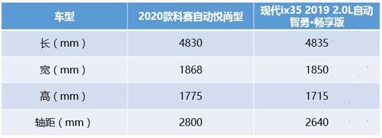 再看2020款科赛,对比两车的数据可以看出,2020款科赛在车身尺寸方面占有明显的优势,长度多了395mm,宽度多了18mm,高度多了60mm,别小看这些多出来的数据,这些可以换来更充裕的头部空间和横向乘坐空间,另外2800mm轴距也比现代ix35要长出160mm,这同级最长的轴距优势让