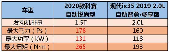 如果以现代ix35的动力水平为标准的话,那2020款科赛的动力装配有点“越级”了,通过比较考验看出,2020款科赛搭载的这款长安蓝鲸1.5T发动机,最大马力为178Ps,最大功率为131kW,最大扭矩265N·m,动力输出更强劲。另外,配合爱信6AT变速箱,动力操控很值得期待,要知道,爱信6AT变速箱拥有技术成熟、质量稳定和大批量产出的成本优势,调校舒适,可在瞬间完成升挡降挡,让驾驶变得更顺畅。