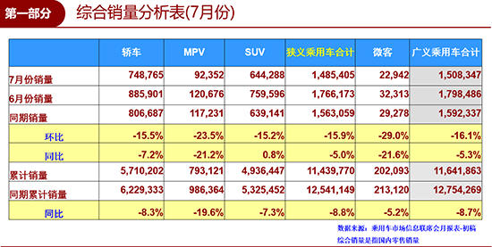 上周五(8月9日),乘用车市场信息联席会(以下简称“乘联会”)发布数据显示:7月,我国狭义乘用车销量达到1485405辆,环比下降15.9%,同比下滑5.0%,车市重回下降通道;不过就1-7月累计销量-8.8%的增速而言,下滑幅度有所收窄。