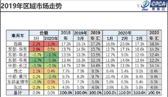 2019年区域市场走势发生了一定的变化,中西部地区车市正在逐渐摆脱低迷状态,2019年西南地区板块所占份额已高达17.2%,中部地区市场份额为14.6%,相比之前变得更加合理和均衡。