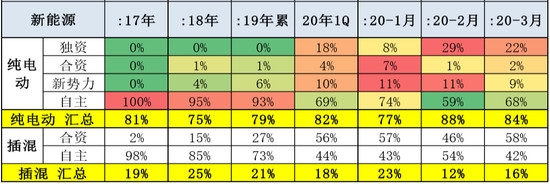 新能源领域自主品牌近年来市场份额越来越少,纯电动车型中,自主品牌从2017年的100%份额跌倒2020年一季度的68%。自主品牌在2017年在混动车型中占比为98%,如今下降至42%,合资占据了剩下58%的市场份额。崔东树表示,总体来看,自主品牌面临着很大的压力。