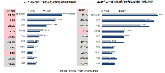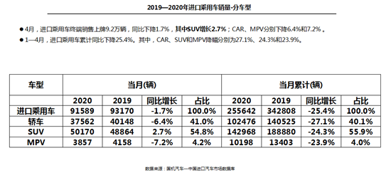 流通协会方面表示,相比于进口车供应的大幅下滑,伴随国内疫情防控进入常态化,汽车市场逐渐回暖,进口车销售呈现企稳态势。4月,我国销售进口汽车9.2万辆,同比下滑1.7%,降幅相比上月大幅收窄,基本达到去年同期水平;1-4月,进口车累计销售25.6万辆,同比下滑25.4%。
