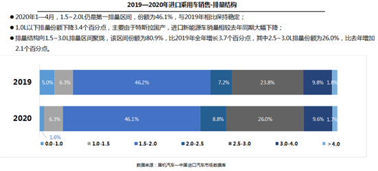 排量结构上,1-4月,1.5-2.0升仍是第一排量区间,份额为46.1%,相比去年同期保持稳定;而1.0升以下排量份额则下降了3.4个百分点。流通协会方面表示,进口车市场排量结构正向1.5-3.0升排量区间聚拢,该区间份额已达到80.9%,比去年全年增长了3.7个百分点;其中,2.5-3.0升排量份额为26.0%,比去年增加 2.1个百分点。