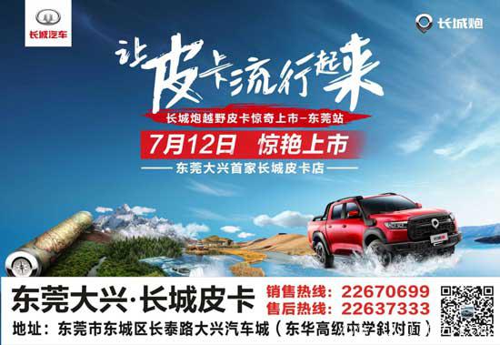 7月12日东莞大兴长城炮越野版东莞站上市发布会 !无限畅玩 · 超级钜惠,长城炮直击底价,等你来撩!想了解更多的新车细节?亲自来一探究竟吧!亲自来感受这款新车的独特的魅力,让皮卡流行起来!长城炮为您揭秘人生惊奇之旅.
