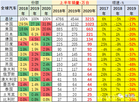 从“主销国家”销量来看,2018年全球汽车销量下降1%,自2010年来首次年度负增长;2019年全球汽车销量9032万辆,同比下降3%;2020年1-6月销量下滑29%。