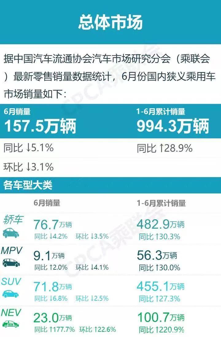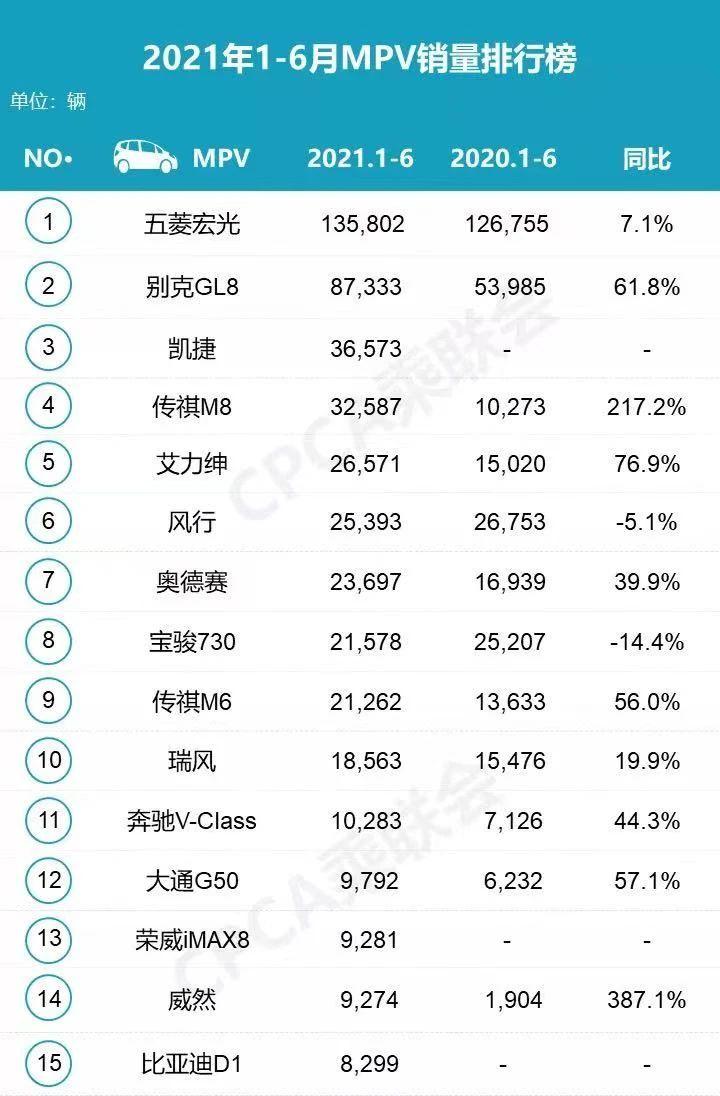 从榜单来看,排名第一的依旧是五菱宏光,因为其体量非常大上半年卖出了135802辆,所以同比增长只有7.1%。其实在乘联会的榜单里,五菱宏光作为MPV是一个非常模糊的概念,因为五菱宏光很难界定它是商用还是乘用。