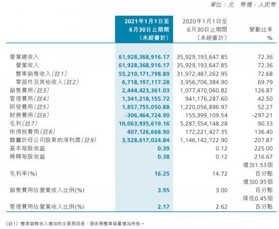 归母净利润仅次于长城的吉利,上半年营收为450.32 亿元,同比增长22%,其中汽车销售收入393.12亿元,同比增长16.58%;毛利率为17.23%,同比仅增长0.11%。光大证券指出,看似增收不增利的背后,是吉利汽车上半年期股权激励费用影响了6.4 亿元净利润,扣除此影响后,吉利汽车上半年合计利润为30.21 亿元,同比增长31%。