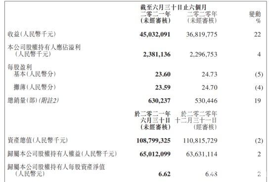 其次是吉利汽车(H股:00175),上半年归母净利润为23.81亿元人民币,同比微增3.67%;