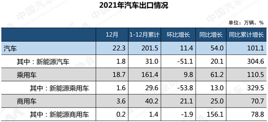 相比之下,汽车出口表现更为亮眼。按照整车企业出口统计口径,2021年,汽车出口201.5万辆,同比增长1倍,占汽车销售总量的比重为7.7%,比上年提升3.7个百分点;12月,汽车出口22.3万辆,环比增长11.4%,同比增长54.0%。