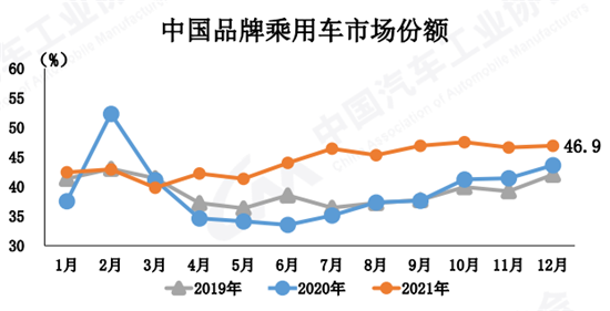 其中,自主品牌市场份额不断提升。数据显示,2021年,中国品牌乘用车共销售954.3万辆,同比增长23.1%,市场份额为44.4%,相比上一年提升6.0个百分点;12月,销售113.7万辆,同比增长10%,市场份额达到46.9%。