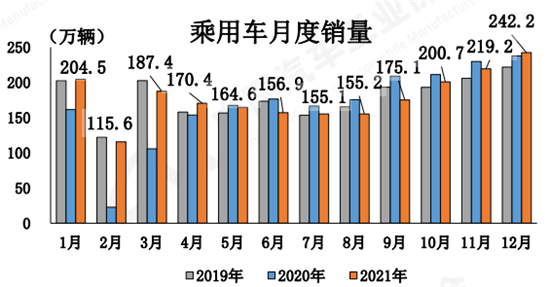 12月,乘用车产销分别完成252.7万辆和242.2万辆,环比分别增长13.2%和10.5%,同比分别增长8.4%和2.0%,增速较11月由负转正。中汽协表示,12月,随着芯片供应问题有所缓解,叠加企业年底冲量因素,乘用车产销有所回升。