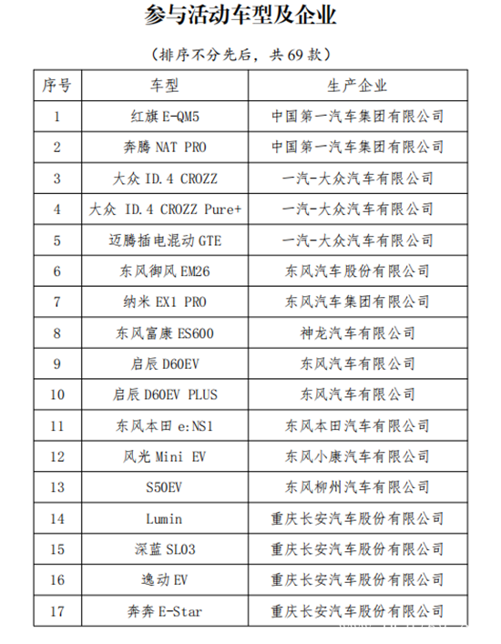 中国经济网6月16日讯(记者 景远)工业和信息化部办公厅等五部门近日印发《关于开展2023年新能源汽车下乡活动的通知》,公布参与活动企业及车型,共计69款。